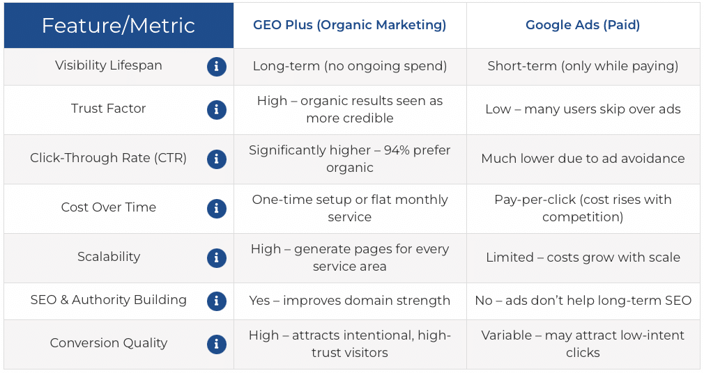 | Feature/Metric | GEO Plus (Organic Marketing) | Google Ads (Paid) |